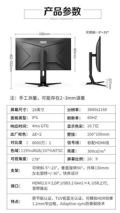 商品名称:AOC U28G2U 28英寸 4K高清 显示器